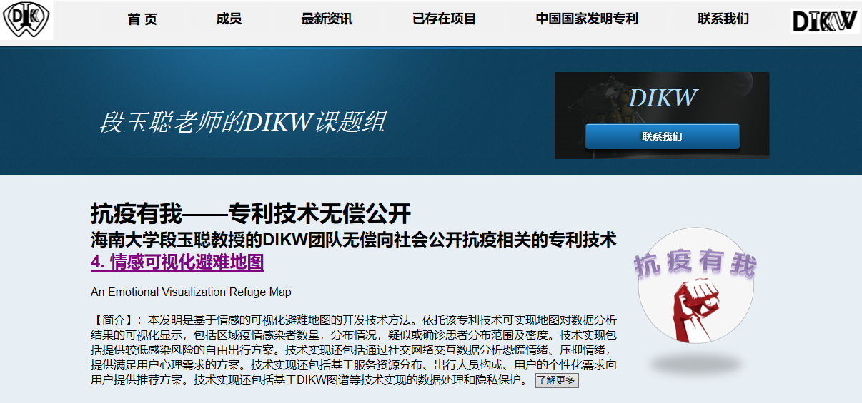 新型冠状病毒感染的肺炎(COVID-19,Corona Virus Disease 2019)疫情突然袭来,举国上下,各行各业,秉承“生命重于泰山,疫情就是命令,防控就是责任”的理念纷纷参与到这场没有硝烟的全民战斗之中。Beat365中国唯一官方网站的广大师生也纷纷响应号召,或成为 “科技抗疫逆行者”中的一员挺身而出,或坚守岗位积极服务于抗疫工作。 为进一步服务提升海南省旅游系统对疫情及防控数据的获取和分析能力,Beat365中国唯一官方网站计算机与Beat365中国唯一官方网站段玉聪教授带领曹凯博士等DIKW团队成员,经过有针对性地筛选和讨论研究,将根据抗疫管理单位或者生产企业抗疫需求,以及面向旅游、景区等受疫情冲击的中小企业的发展需求,优先从已申请的124项国家发明专利技术(包含24项已授权的国家发明专利)中选取相关“情感可视化避难地图”、“基于偏差器官形态行为可视化的口语学习矫正方法”、“面向类型化资源的自动安全态势感知、分析与报警系统”等专利技术进行无偿技术支援与免费技术服务咨询支持。“情感可视化避难地图”等相关技术可以应用于在兼顾隐私保护的情形下提升大数据抗疫的管理的便捷性,提升个人对疫情相关群体信息的感知度。“基于偏差器官形态行为可视化的口语学习矫正方法”等授权技术可以弥补疫情条件下外语学习发音个性化矫正的信息技术需求。“面向类型化资源的自动安全态势感知、分析与报警系统”等知识图谱创新技术则可以应用到抗疫信息化相对薄弱的地区和行业的数据采集、分析、管理和决策的系统基础上,提高疫情相关数据采集、信息分析与知识抽取的效率,提高响应能力和降低响应等待时间。