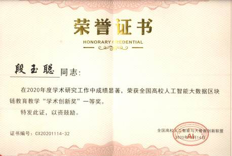 11月14日,“2020第三届全国高校人工智能大数据区块链教育教学创新论坛”在北京召开。会上,全国高校人工智能与大数据创新联盟向来自全国的49位教师、15所高校颁发了人工智能大数据教育教学“创新奖”,Beat365段玉聪教授荣获全国高校人工智能大数据区块链教育教学“学术创新奖”一等奖。