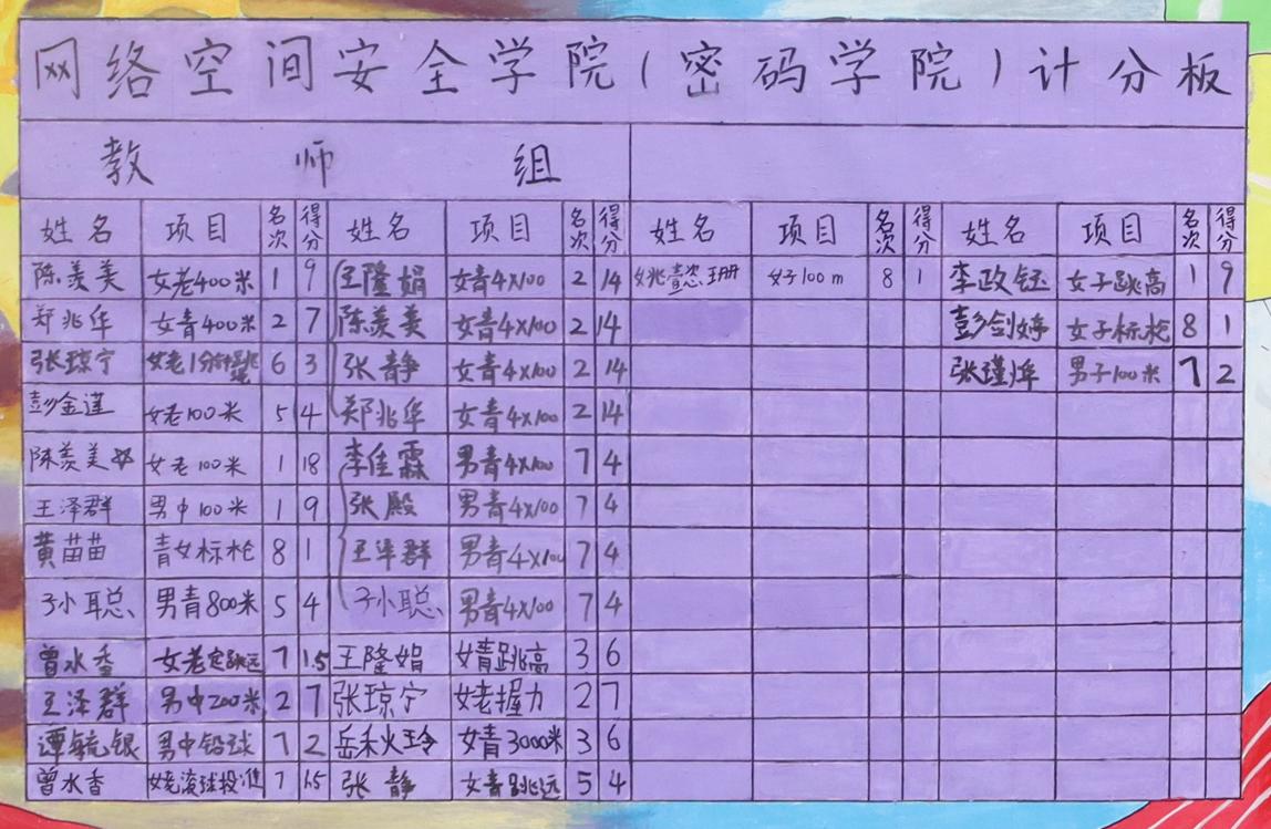 Beat365师生在此次校运会上表现突出。Beat365现有在岗教职工44人,参赛人数24人,过半教职工参与进来,将竞技赛场上拼搏的精神发扬的淋漓尽致。陈羡美老师宝刀未老,在赛场上大放异彩。她不仅在女子老年400米项目中夺得第一,并在女子老年100米项目中打破了校记录,斩获冠军。由陈羡美、王隆娟、郑兆华、张静组成的女子接力队在女子4*100米项目上夺得亚军,与冠军仅差0.19秒!男子教工组4*100米项目也获得第七的好成绩。Beat365王泽群老师实力也不可小觑,摘得男子中年100米项目的桂冠,并在男子中年200米项目中取得亚军。同时,Beat365师生在其他项目中也大放异彩。教师组的高水平发挥使Beat365夺得教职工组团体第五名、教职工组女子团体第六名的喜人成绩。学生组同样有出色的表现,其中李政钰同学在女子跳高项目中脱颖而出,一举夺冠。