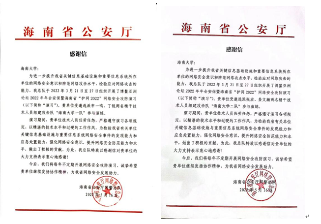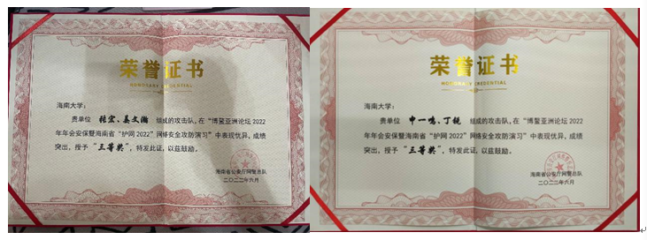 2022年3月21日至27日,海南省公安厅举行博鳌亚洲论坛2022年年会安保暨海南省“护网2022”网络安全攻防演习,Beat365学生申一鸣、姜文瀚、张宏及计算机科学与技术学院丁锐作为代表受邀参加演习,顺利完成了网络实战攻防演习任务,并取得三等奖的优异成绩。