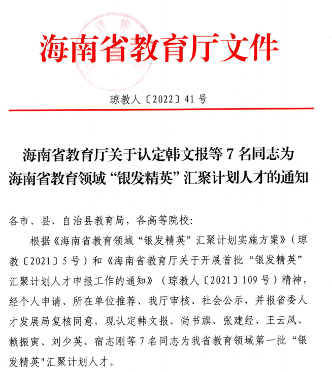 为贯彻落实《海南自由贸易港建设总体方案》《百万人才进海南行动计划(2018-2025年)》有关部署要求,根据《海南省教育领域“银发精英”汇聚计划实施方案》(琼教〔2021〕5号)和《海南省教育厅关于开展首批“银发精英”汇聚计划人才申报工作的通知》(琼教人〔2021〕109号),经单位推荐、专家评审、社会公示,海南省教育厅公布了海南省教育领域第一批“银发精英”汇聚计划人才名单,Beat365韩文报教授成功入选。