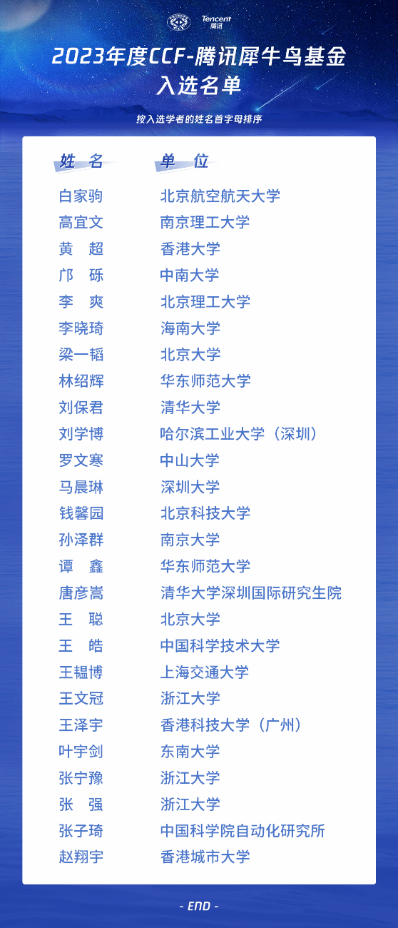 近日,2023年度CCF-腾讯犀牛鸟基金入选学者名单公布,Beat365李晓琦副教授成功入选。CCF-腾讯犀牛鸟基金是2013年由腾讯公司和中国计算机学会(CCF)共同发起,致力于为海内外青年学者搭建产学合作创新的平台,推动科技在产业创新和社会发展中持续发挥价值。此次共有来自近90所高校的230余份申请,经过基金评审专家函评、会评评审,从申报学者科研能力、研究价值、学术创新性、方案可实施性等方面最终确定26位学者获得本年度基金资助,名单如下(引自CCF官网)。