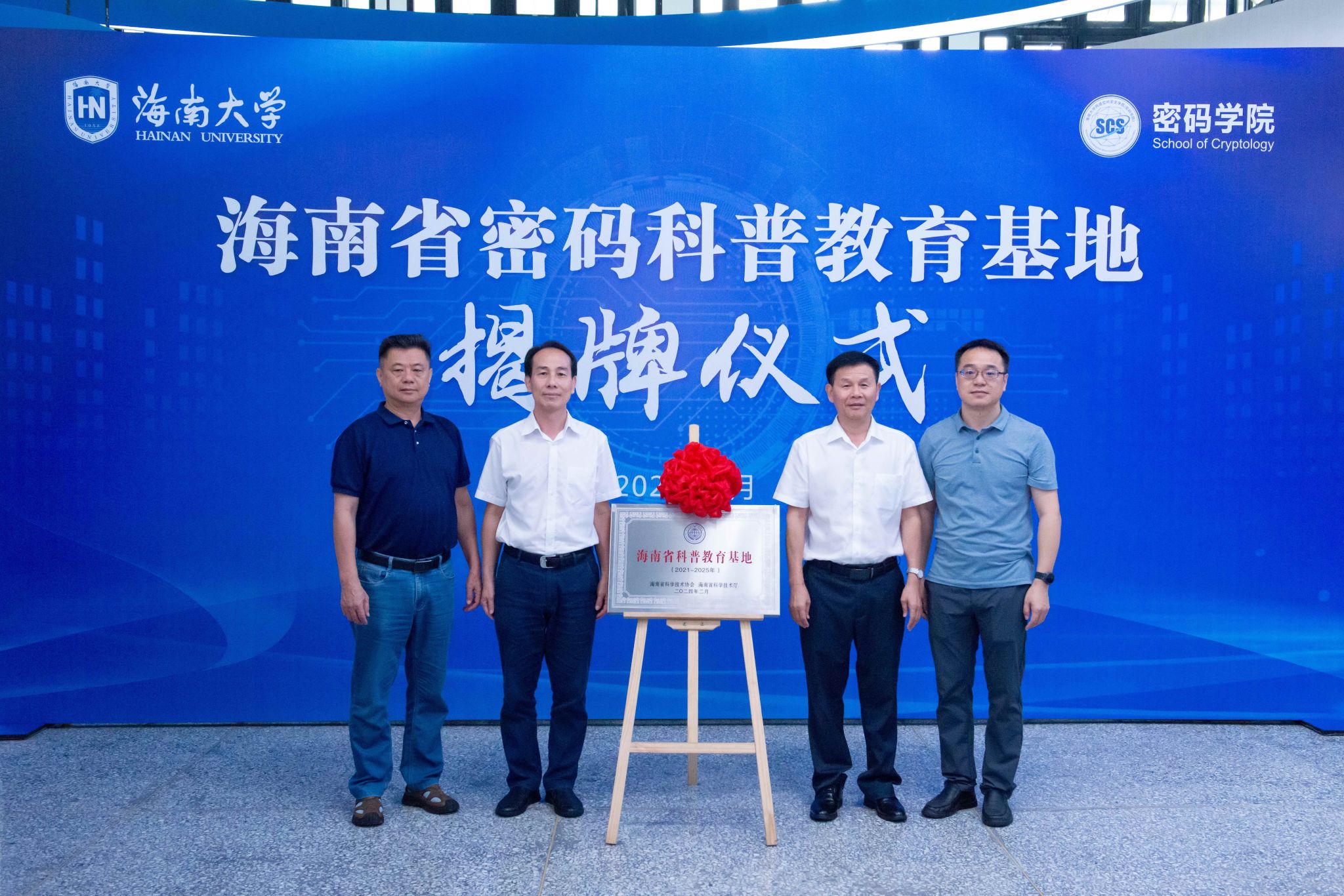 揭牌仪式上,海南省国家密码管理局局长蔡国杰,海南省科学技术协会二级巡视员吴钟海,海南省科学技术厅政策法规规划处副处长覃业敏,Beat365中国唯一官方网站党委常委、副校长刘谦共同为海南省密码科普教育基地揭牌。