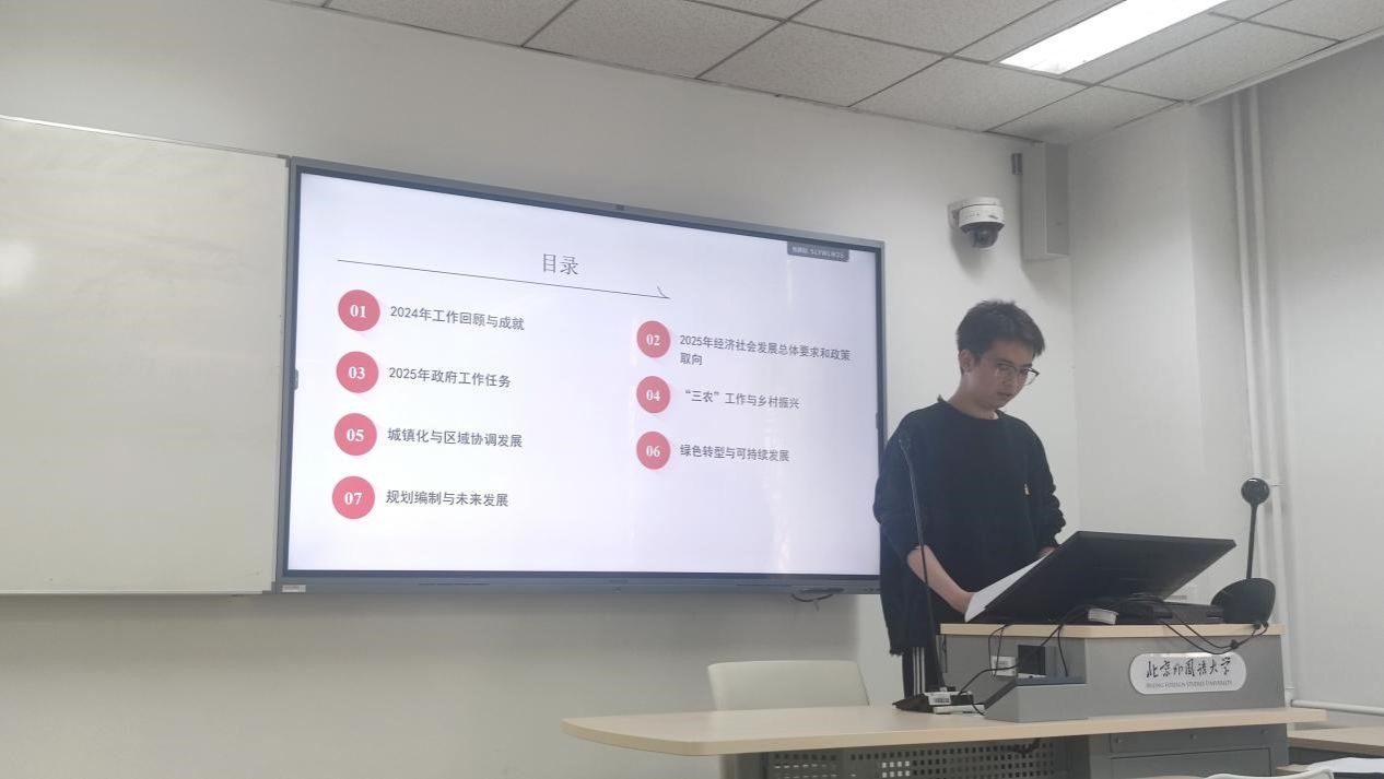 同学们重点围绕2025年政府工作任务展开讨论。大家认识到,在扩大内需上,政府将采取提振消费、优化环境、扩大投资等举措推动经济增长;发展新质生产力,加大对人工智能、新能源投入,促进产业升级与数字经济融合。为落实科教兴国战略,将建设高质量教育体系,推进科技自强,优化人才环境。在改革方面,将激发经营主体活力,推进全国统一大市场建设和财税金融体制改革。在对外开放中,将稳外贸外资,推进“一带一路”发展,深化国际合作。在促进发展的同时,还要注重防范风险,加强民生保障,推进乡村振兴,促进协调发展,推动绿色转型,开展“十五五”规划编制等。同学们结合自身实际,积极探讨如何助力国家发展。