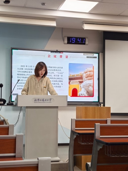 在本次学习会上,郝雨辰书记率先发言,主要从会议背景、学习内容、学习讨论和学习总结四个部分展开了领学。郝雨辰书记首先介绍了会议背景,强调今年全国两会是在“十四五”规划收官之年、“十五五”规划谋划之年召开的一次十分重要的会议,对于进一步坚定夺取新时代中国特色社会主义新胜利的决心和信心,具有重大而深远的意义;然后就具体学习内容展开,带领同学们深入研读并学习了习近平总书记在江苏代表团审议时的重要讲话精神、习近平总书记在看望民盟、民进、教育界委员并参加联组会时的重要讲话精神、习近平总书记在出席解放军和武警部队代表团全体会议时的重要讲话精神、政府工作报告的主要内容及精神、以及全国人大常委会、全国政协常委会工作报告、“两高”报告中相关内容等五个方面的内容。郝雨辰书记强调了学习两会精神对于党员个人成长以及党支部发展的重要性。她指出,两会承载着国家发展的重要决策与战略方向,深入领会两会精神能够让党员们更好地把握时代脉搏,将个人的学习与实践紧密结合到国家的发展需求之中。随后,书记带领全体党员对两会的核心内容进行了系统梳理,从政府工作报告中的关键举措到民生保障领域的重要部署,都进行了详细解读,让党员们对两会精神有了更为直观和深入的理解