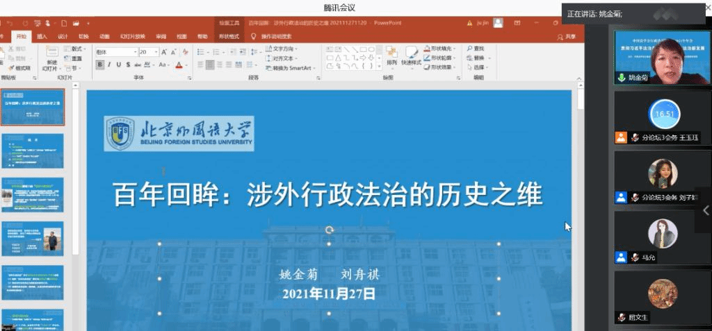 年会第三分论坛“涉外行政法治问题”第一单元,姚金菊教授就《百年回眸:涉外行政法治的历史之维》作主题报告。姚金菊教授将“涉外行政法治”置于百年历史及百年未有之大变局视域,从涉外行政主体的机构设置、涉外行政执法的管辖与教育主权安全、海外华工的涉外行政保护三个角度讨论并反思百年之前清政府应对涉外事务的法治建设。通过梳理历史经验教训为我国涉外行政法治建设提供借鉴,提出近代以来中国政府处理涉外事务实际上也是中国走入世界体系的法治实践过程,中国政府必须学习运用法治方式与世界形成有效对话;涉外法治的核心是行政法治,政府应对涉外事务的法治意识和法治能力即法治政府建设是新时代制度型开放的关键。指出行政法学统筹国内法治与涉外法治研究时,应当突破传统的国内公法定位,发现行政法的全球面向,以行政法治为基础构建“制度型开放”。