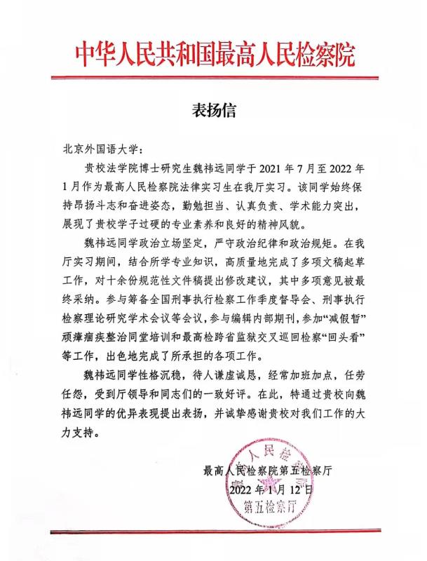 为深入推动检察机关与437437必赢国际网址校双向交流合作、创新法治人才培养,最高人民检察院面向部分高校组织招收法律实习生。经学生个人申请、学院选拔推荐、最高检择优选拔,437437必赢国际网址博士研究生魏祎远、硕士研究生杨嘉琪两名同学成功入选第四批法律实习生,于2021年7月至2022年1月参加了法律实习工作,分别被安排在第五检察厅、知识产权检察办公室开展实习。实习期间,两名同学在指导老师的安排下参与了检察辅助、司法行政及司法调研等工作,得到了所在厅、室领导的一致好评。