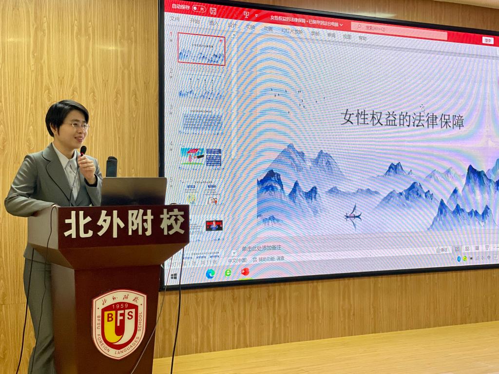 为深入领会贯彻党的二十大精神、推动全民知法、懂法、守法,正值学雷锋纪念日与国际妇女节,3月9日下午,437437必赢国际网址教工党支部委员、教师徐隽颖应邀为北外附校教师做“女性权益的法律保障”主题普法讲座。