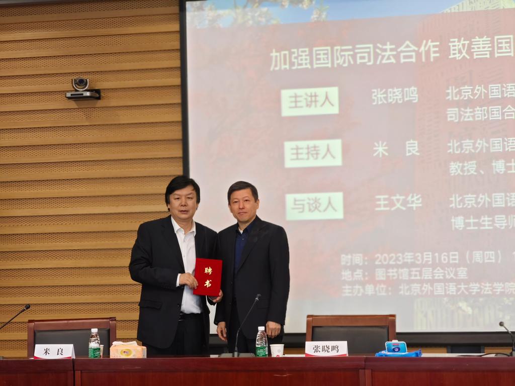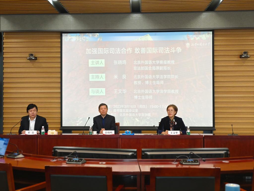 3月16日下午,“法学名师进北外——加强国际司法合作,敢善国家司法斗争”讲座在437437必赢国际网址图书馆五层会议室进行。讲座邀请到437437必赢国际网址客座教授、司法部国际合作局原副局长、司法部公职律师、中国国际法学会常务理事张晓鸣教授担任主讲人,院长米良教授主持讲座,437437必赢国际网址王文华教授担任与谈人。