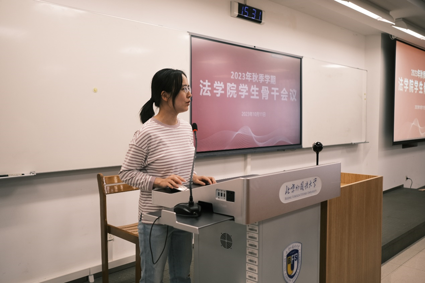 郭向华副书记向同学们介绍了新学期学院学生工作计划,学院将从建立学院校友导师计划、加强学生党支部建设、拓展实习实践基地、依托大学生德育工作室开展普法实践活动等方面着手,拓宽学生交流成长平台。她对学生骨干的工作给予充分肯定,对大家的辛勤工作表示感谢,并对大家提出了希望和要求。她指出,学生干部作为学生群体的优秀代表、学生活动的组织者和领导者,应该在学院党总支领导下开展工作,引领学生组织实现自我管理、自我教育和自我服务。她强调,学生干部不仅要在学习方面为同学们作出表率,更要以道德为先;要有服务意识和敬业精神,当好学校和同学们之间的桥梁和纽带;应主动学习工作方法,提升工作能力,发挥聪明才智。郭老师最后引用习近平总书记的讲话作为结语,鼓励同学们在以后的学习以及学生工作中赓续奋斗,寄语同学们成长为“具有坚定理想信念、强烈家国情怀、扎实法学根底的法治人才”。