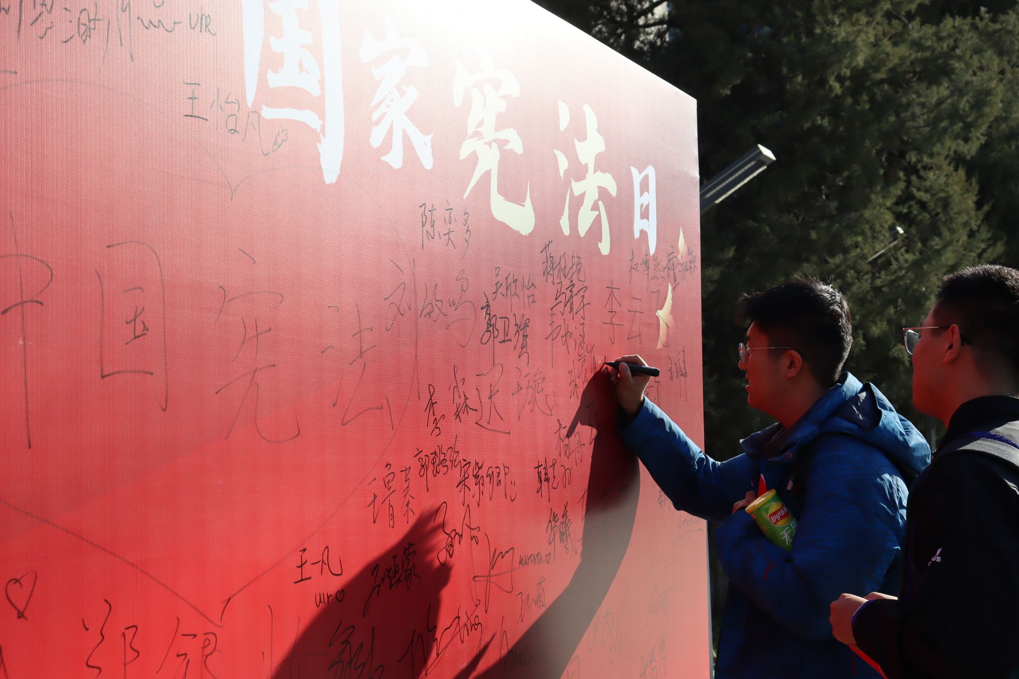 当天中午,北外丽泽法律社在文化广场举办了“国家宪法日”宣传活动。活动通过互动问答、签名留念及发放宪法读本等环节,以寓教于乐的方式普及了宪法知识。主办方还为每位参与者准备了丰富多样的纪念品,极大地调动了师生参与活动的热情。