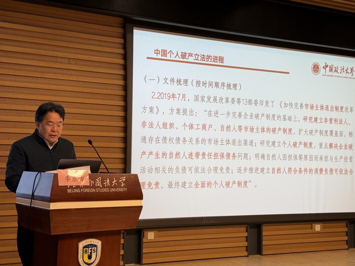 中国政法大学李东方教授围绕“个人破产立法与强制执行若干问题的思考”进行了发言,他首先梳理了中国个人破产立法的进程,其次强调了执行失能应被确立为个人破产认定的核心原因性标准,最后也就个人破产制度与民事诉讼制度的协调以及个人破产制度与企业破产制度的协调进行了探讨。