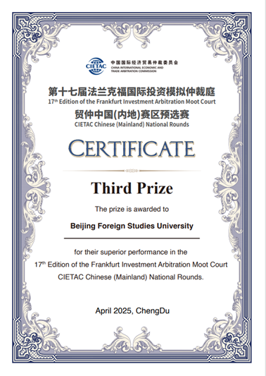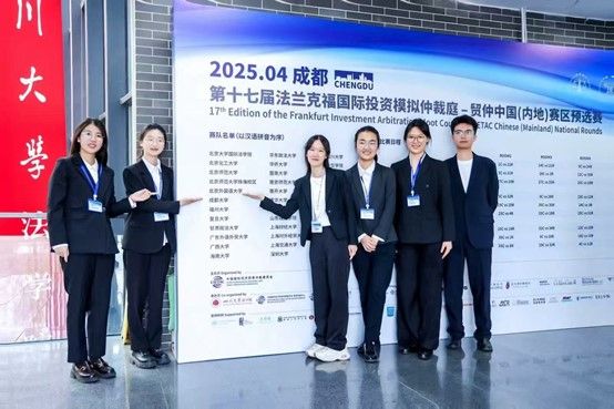 2025年4月7日至11日,第十七届法兰克福国际投资模拟仲裁庭(Frankfurt Investment Arbitration Moot Court)贸仲中国(内地)赛区预选赛比赛在四川大学举行。本届比赛吸引了清华大学、复旦大学、上海交通大学、中国政法大学、华东政法大学、北京大学国际437437必赢国际网址等37所全国知名高校赛队注册参加,由80余名中外法学专家担任仲裁员。我校代表队在循环赛中总分排名第十四。其中,本科2022级张子玉同学和王纯瑶同学荣获循环赛“最佳辩手“称号(Best Oralist, General Rounds),张子玉同学荣获“团队贡献奖”(Outstanding Contribution Award)。