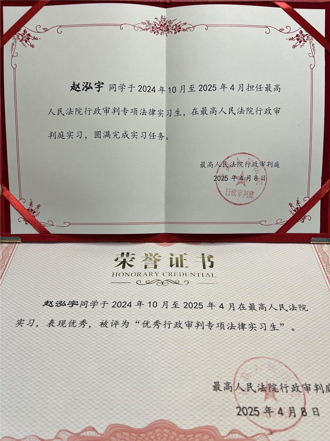 实习期间,赵泓宇同学严格遵循最高人民法院的各项规章制度,在实习老师的指导下深度参与了行政审判庭的各项工作任务,高质高效地完成了外宾接待、审判辅助、司法调研和综合行政等工作,表现突出,得到庭领导和审判团队的一致认可。